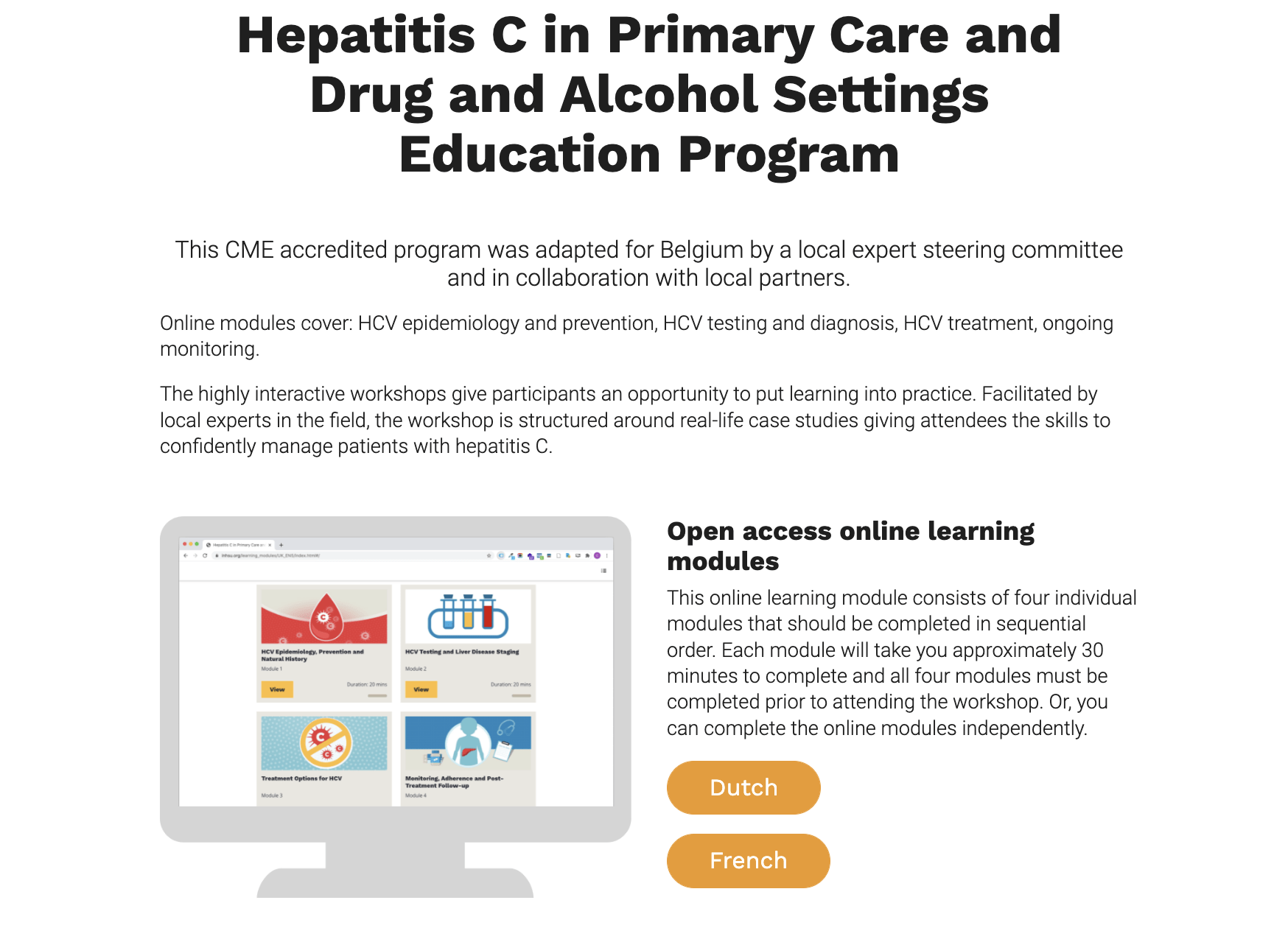 INHSU HCV in primary care and drug and alcohol settings heeft een programma ontwikkeld om de zorg voor hepatitis C te verbeteren. Deze online module, aangepast door het Belgian Network on Hepatitis in Substance Users, leert u welke patiënten getest moeten worden, hoe te verwijzen, welke behandelingen ze krijgen, en wat er moet gebeuren na een succesvolle behandeling. Het doorlopen van deze module duurt een tweetal uur, en accreditatie is voorzien (eveneens punten ethiek en economie). We hopen dat u de tijd vindt om dit programma te doorlopen, zodat we samen een eerste stap kunnen zetten richting 2030!